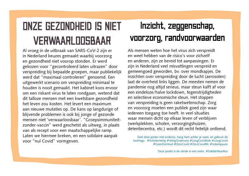 De bijgaande reeks posters is een voorstel om te stoppen met de huidige beroerde aanpak van de pandemie, en te beginnen met solidair indammen. Waar de Nederlandse regering voor gekozen heeft en nog steeds voor kiest - het virus zogenaamd “gecontroleerd laten rondgaan” en “sturen op IC-capaciteit” - levert alleen meer ellende op. Dit is inmiddels veel mensen duidelijk. Maar wat dit ook inhoudt, is dat een adequate respons eigenlijk nu pas begint, en dat de onmisbare randvoorwaarden erbij nog vormgegeven moeten worden.