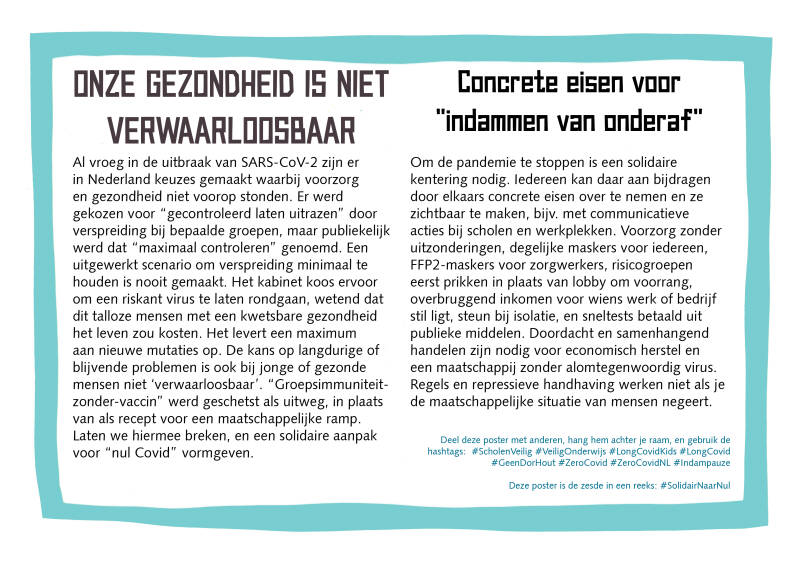 Wat we willen met deze posters is meer bekendheid geven aan de ZeroCovid-aanpak. Het idee daarvan is niet dat Covid-19 direct volledig zal “verdwijnen” (dat het virus als zodanig “geëlimineerd” wordt), maar wel op een miniem niveau komt in vergelijking met nu. Dat betekent dat we samen de circulatie van het virus in korte tijd grondig naar beneden drukken, en transmissieketens maximaal onderbreken. Als het aantal besmettingen verlaagd is met de combinatie van alle effectieve middelen (en zonder ontkenning van de rol van aerosolen, of de rol die kinderen bij verspreiding spelen), kan het bron en contactonderzoek worden hervat. Zodat we uit de crisis komen zonder wie dan ook onder de bus te gooien, in lijfelijke of economische zin.